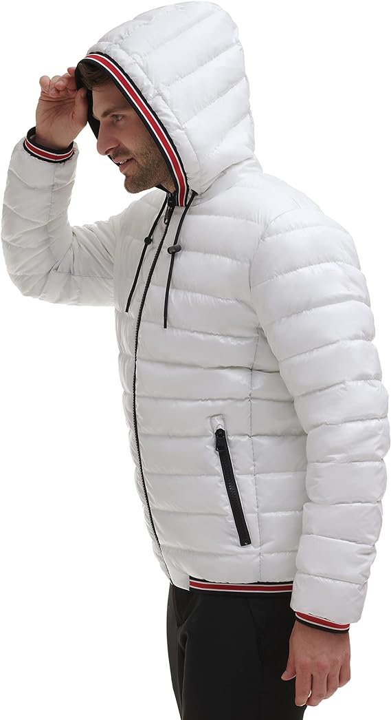 Designer features: sporty knit detailing is featured on the hood and cuffs, and two large side pockets give this quilted jacket added flare and function