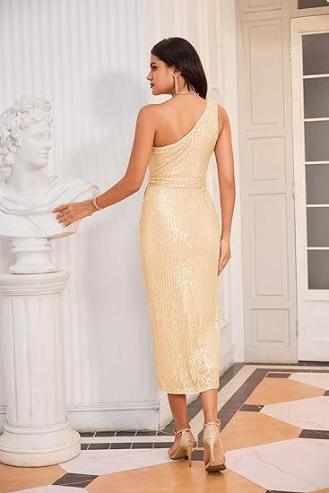 - 【Unique Design】This sequin cocktail dresses has a unique design with sequins, one shoulder, sleeveless, invisible zipper, front slits, bodycon wrap ruched skirt to hide tummy, with finely tailored lines along the curves of the bust waist and hips, show your charming.