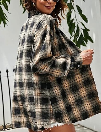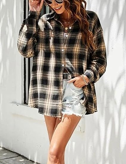 Womens Flannel Plaid Shirts Oversized Button Down Blouse