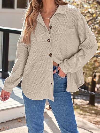 Design: These womens casual jackets down shirts feature a long sleeve,chest pockets,loose fit,lounge style, solid color, button closure, boyfriend style, lapel v neck and waffle knit design ,standard size, adding a trendy and fashionable touch to your wardrobe.